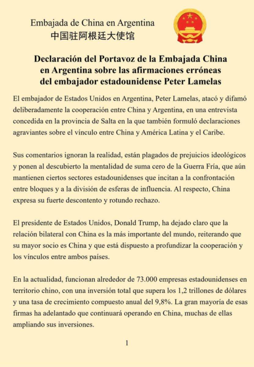 La Embajada de China en Argentina difundió una declaración oficial en la que cuestionó las afirmaciones del embajador de Estados Unidos en el país, Peter Lamelas, realizadas en una entrevista concedida a El Tribuno. En el documento, el portavoz de la representación diplomática china sostuvo que el funcionario estadounidense “atacó y difamó deliberadamente la cooperación entre China y Argentina”, además de formular “declaraciones agraviantes sobre el vínculo entre China y América Latina y el Caribe”.