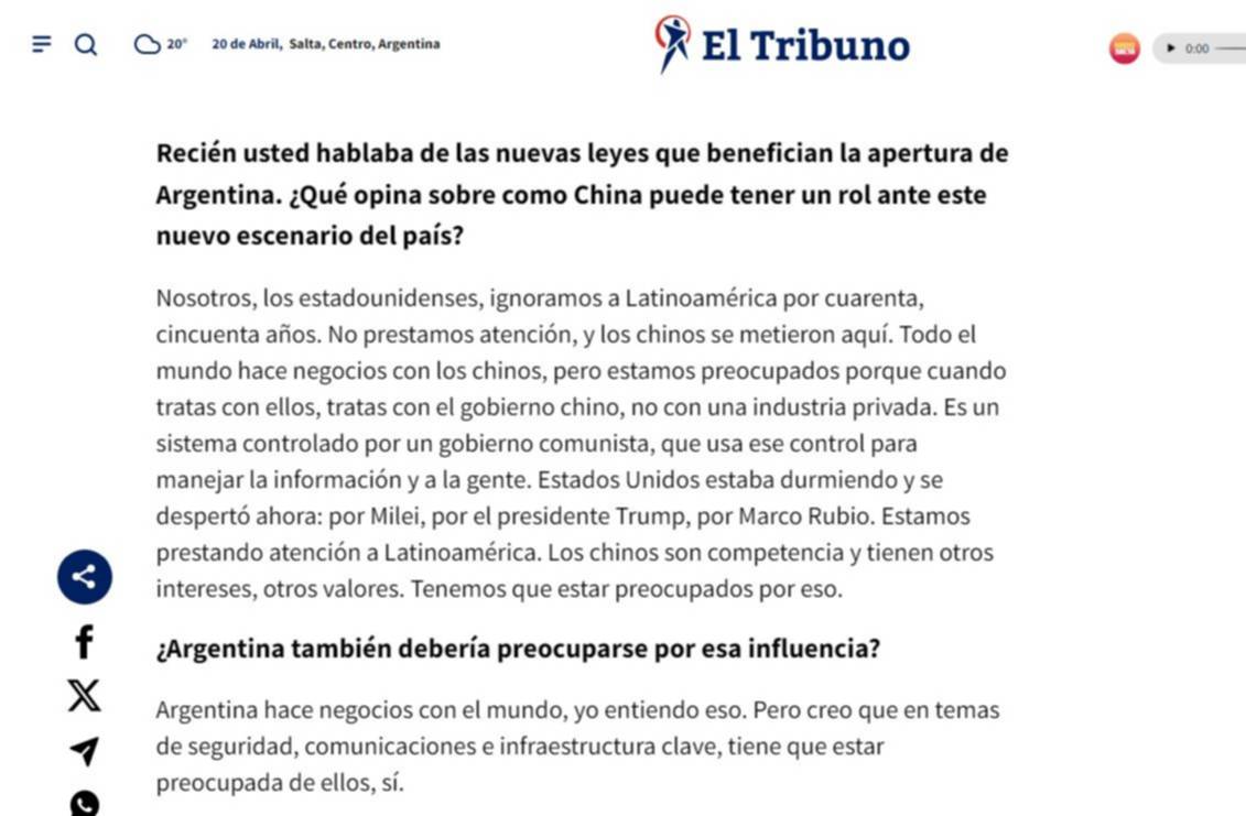 En ese contexto, las declaraciones del embajador de Estados Unidos se dieron cuando fue consultado sobre el rol de China en el nuevo escenario económico argentino. Ante esa pregunta, Peter Lamelas sostuvo: “Nosotros, los estadounidenses, ignoramos a Latinoamérica por cuarenta, cincuenta años. No prestamos atención, y los chinos se metieron aquí. Todo el mundo hace negocios con los chinos, pero estamos preocupados porque cuando tratas con ellos, tratas con el gobierno chino, no con una industria privada. Es un sistema controlado por un gobierno comunista, que usa ese control para manejar la información y a la gente”.